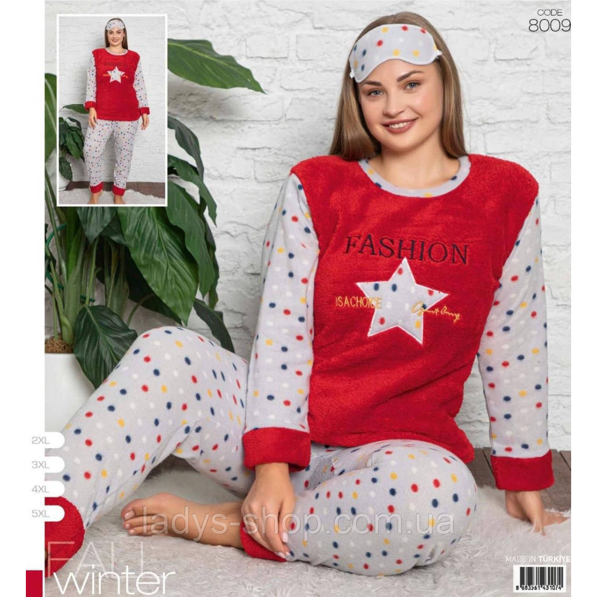 Жіноча тепла піжама батал, штани + лонгслів манжет + маска софт + фліс